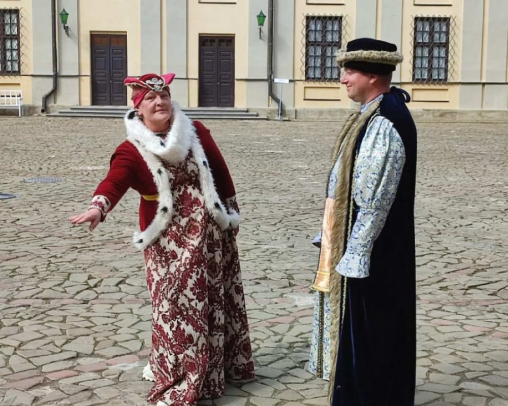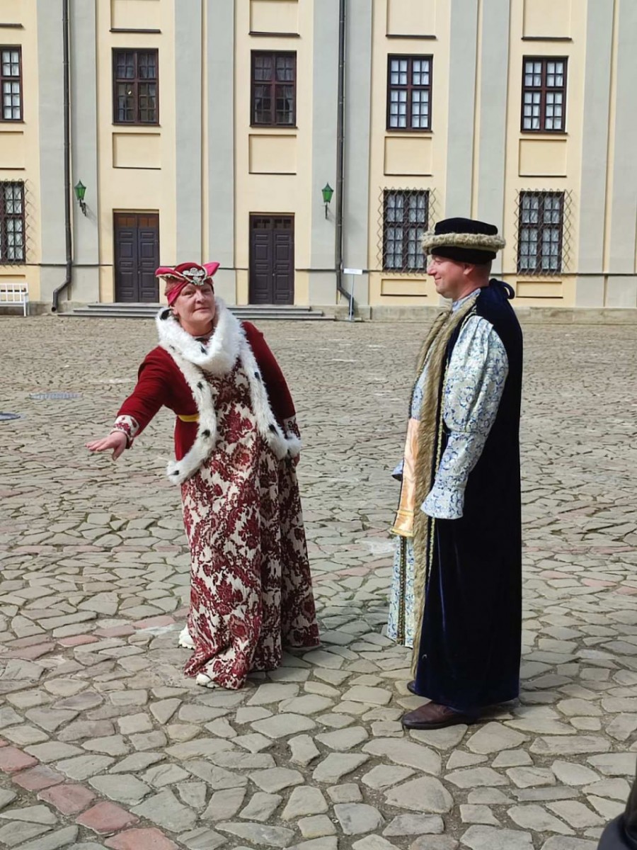 В завершении экскурсии по замку я решила устроить маленькое шоу для ветеранов. Александр Станиславович меня поддержал. Мы переоделись в костюмы той эпохи и вышли на площадь…Ах! Я почувствовала себя звездой на сцене театра…. зрителями были не только наши, но и иностранные туристы!!! Ай да мы! Культура и Профсоюз!!! Но не этот момент стал завершающей точкой.